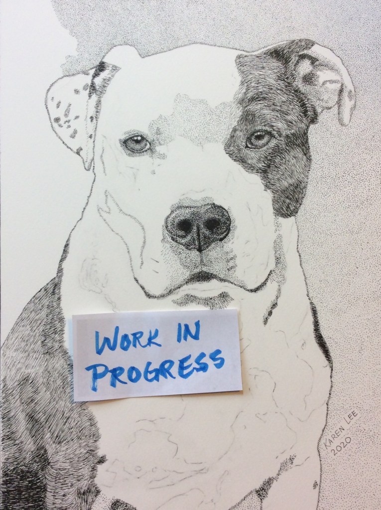 Doing these art challenges is motivating, in this case has kick started work on a pen-and-ink portrait (with a mixed media lined up and an oil that’s waiting on a special size canvas). Today the relief I felt when the election was finally called for Biden – Harris, makes me realize how much Election Stress Disorder I had! So many hours of sleep lost to doom scrolling my news feeds and Instagram. Being rid of that stress this morning it’s now enjoyable and interesting to listen to the political news as I work on this portrait.