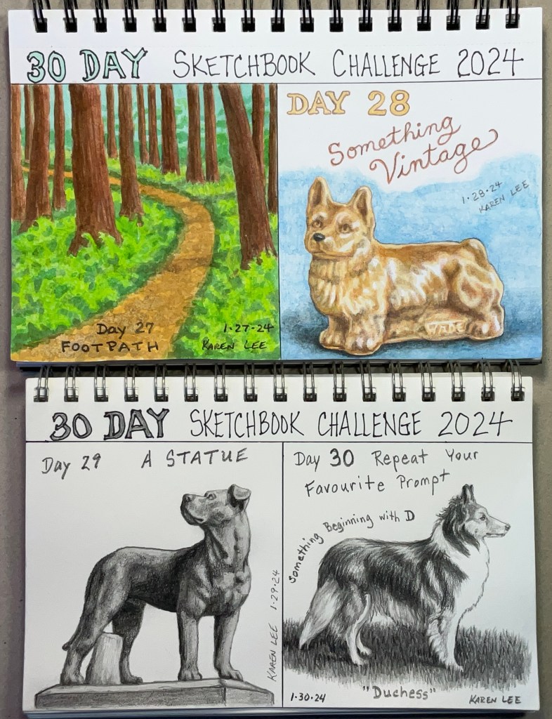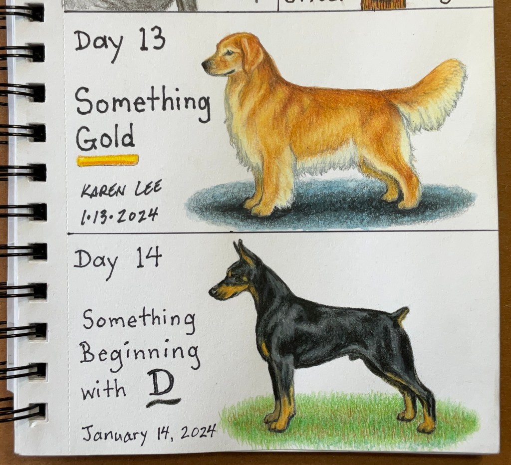 As always for art challenge prompts I try to figure a way, if possible, to have a dog be the subject. Or at least an animal. So I really enjoyed that there were 10 prompts in this 2024 January sketching challenge that were “dog-able” ….my new word for “I can draw / paint a dog for this!” Extra fun that for a couple my own dogs were the models. Here’s some sketches from this year’s challenge: